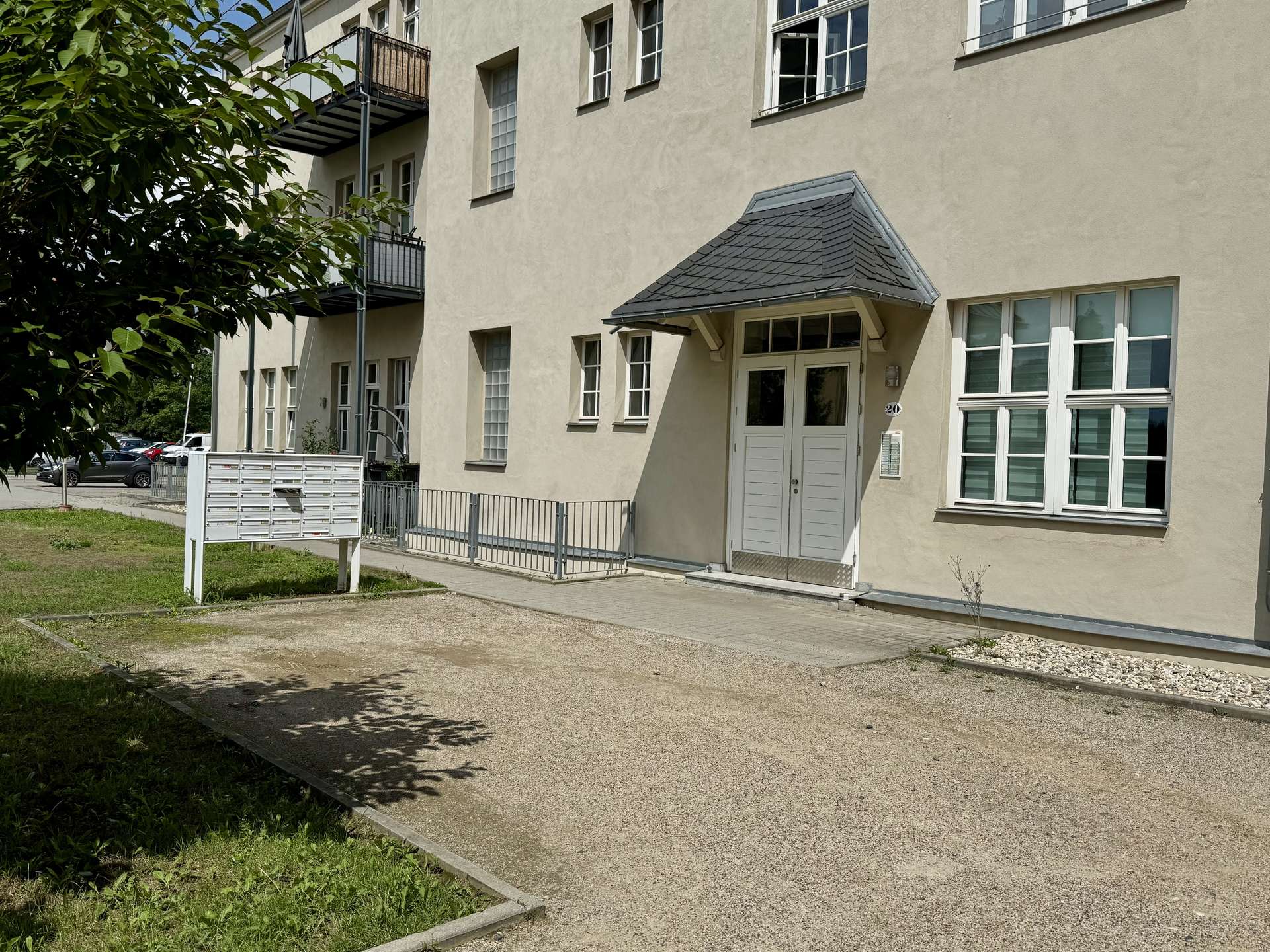 Die Wohnung befindet sich in einem ruhigen, gewachsenen Wohngebiet in Radebeul-Ost. Die Umgebung ist geprägt von gepflegten Altbauten, sanierten Mehrfamilienhäusern und begrünten Innenhöfen, die eine angenehme, nachbarschaftliche Atmosphäre schaffen. Die Straße selbst ist eine verkehrsberuhigte Zone mit wenig Durchgangsverkehr und bietet ein ruhiges Wohnumfeld mit viel Grün.