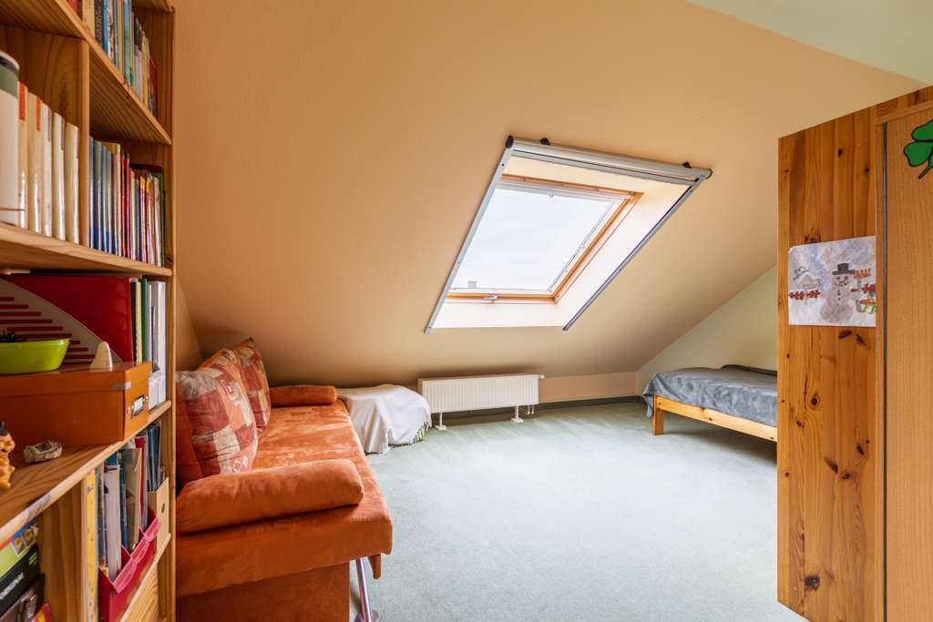 Im Dachgeschoß befinden sich zwei weitere Kinder-/Arbeitszimmer sowie eine kleine Abstellkammer, in der die Heizungstherme untergebracht ist. Da die beiden Zimmer nur durch Trockenbauwände abgetrennt sind, könnte man diese beiden Zimmer auch wieder zu einem großen Zimmer zusammenlegen.